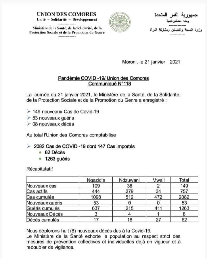 754 cas positifs dont 444 à Ngazidja, 279 à Anjouan et 34 à mwali restent actifs sur l’ensemble du territoire nationale. 8 nouvelles personnes sont mortes ces 24 heures dernières, 4 à Anjouan, 3 à Ngazidja et une à mwali. Le nombre total de décès s’élève à 62. 53 nouvelles personnes sont déclarées guéries du COVID-19, 1263 au total.