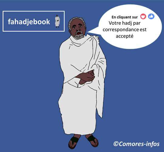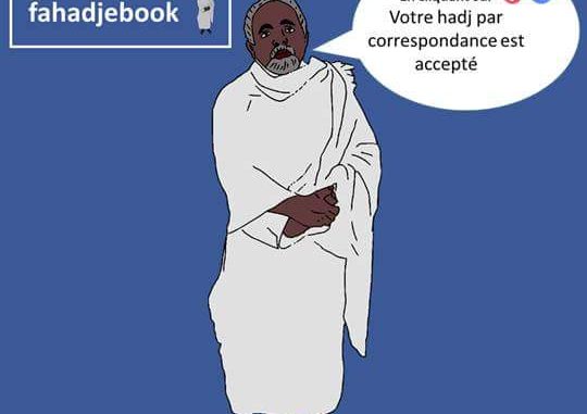 Dessin Satirique. Le ministre vous aide à accomplir le Hadj sans vous déplacer : Il suffit de cliquer sur j’aime ou sur j’adore.
