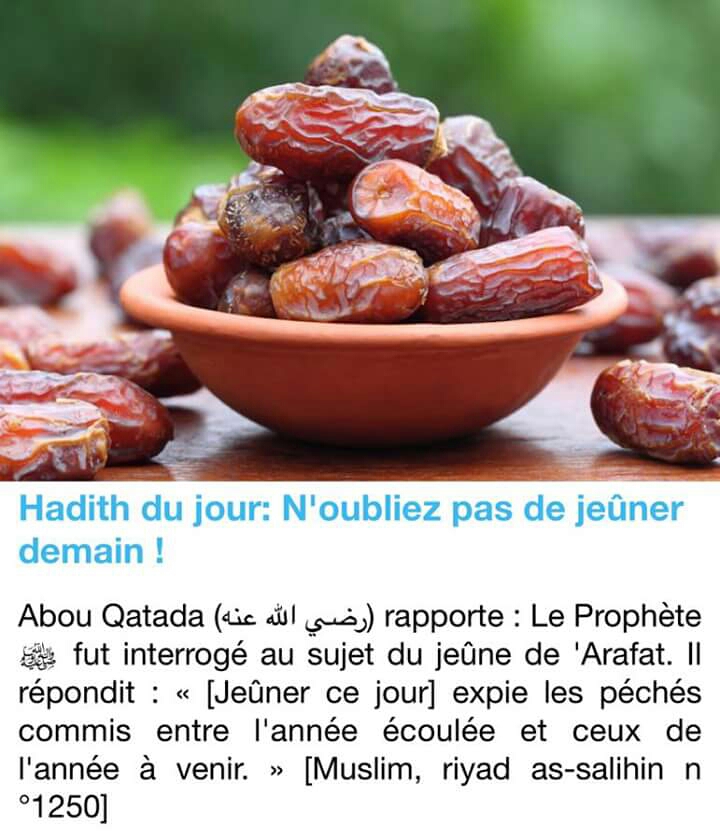 C’est juste pour vous rappeler que le Dimanche 11 septembre, c’est le Jour d’Arafat, insha’Allah. Le prophète (SWS) a dit : celui qui jeûne le Jour d’Arafat, a effacé tous les péchés de l’année(يٌكفر السنة الماضية) précédente et de l’année en cours.
