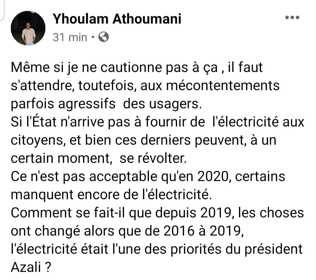 C’est dans une publication sur Facebook que le jeune juriste et Azaliste, Yhoulam Athouman critique le gouvernement sur le manque de l’électricité dans les villes et villages aux Comores. Il ne cautionne pas la violence suite aux affrontements qui ont eu lieu dans le Oichili mais il tire la sonnette d’alarme.