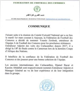 La fédération comorienne de football vient enfin d’officialiser le nouveau sélectionneur de l’équipe nationale à moins de trois semaines du match contre l’Éthiopie au stade de maluzini. Sans surprise, Il s’agit en effet du marocain Younès Zerdouk, ancien bras droit de Amir Abdou depuis 2017. C’est un choix tellement sage selon les chroniqueurs sportifs comoriens. La FCF a par ailleurs choisi la continuité et la stabilité du groupe afin de mieux préparer les échéances à venir.