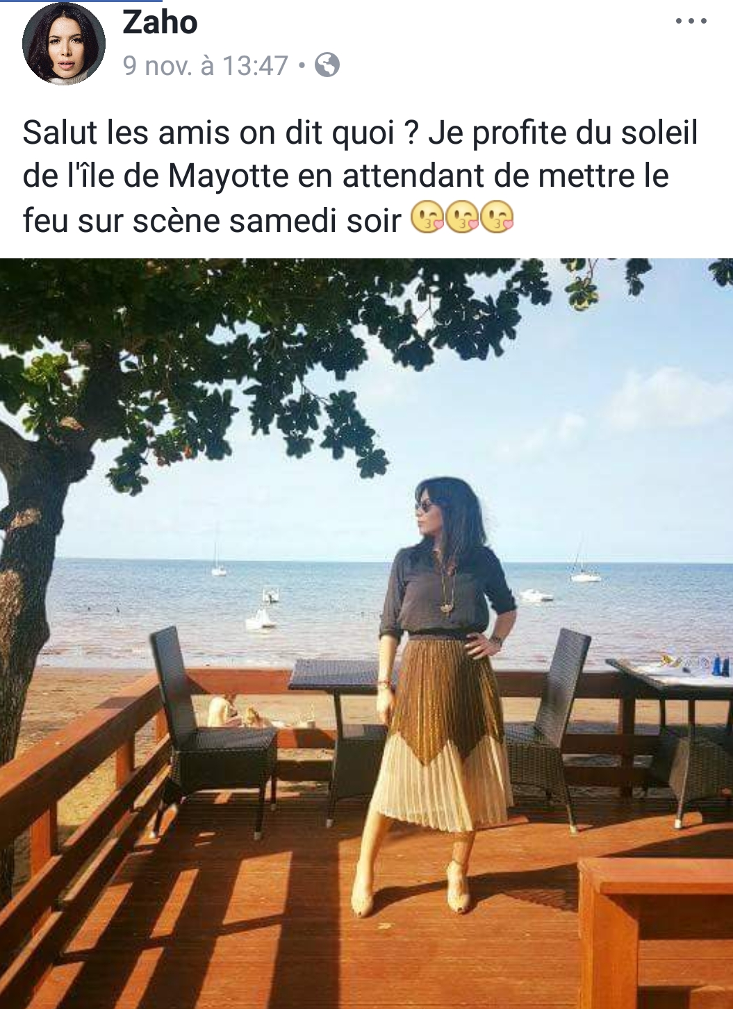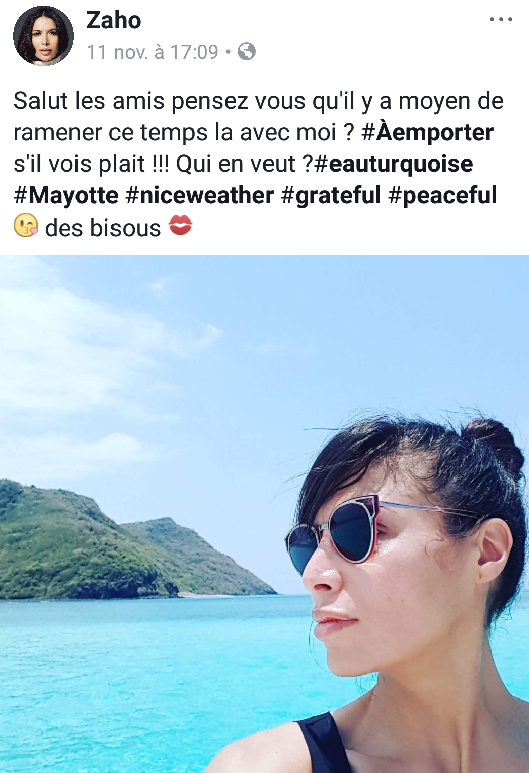 Le paysage unique de l’île Comorienne de Mayotte a fait chavirer le coeur de la chanteuse Zaho. Des plages aux eaux bleu profond ou turquoise, au sable blanc qu’on retrouve partout dans les autres îles des Comores. Sur sa page Facebook, Zaho partage ses moments passés sur l’île.